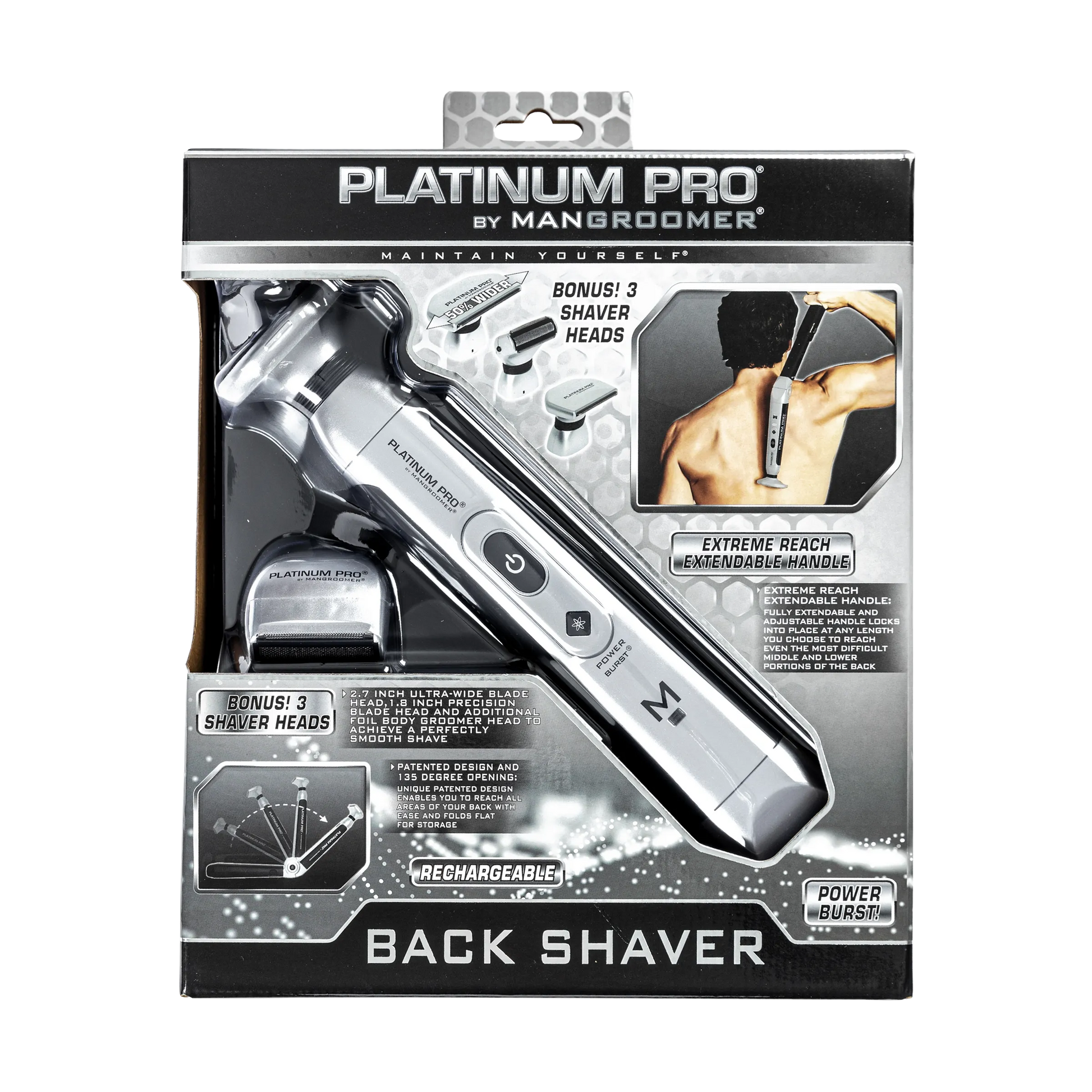 - The new PLATINUM PRO by MANGROOMER Back Hair Shaver's unique patented design will enable you to reach all areas of your back by yourself with ease and shave off all your back hair effortlessly, plus added POWER BURST button to shave and trim through extra thick and coarse hair
