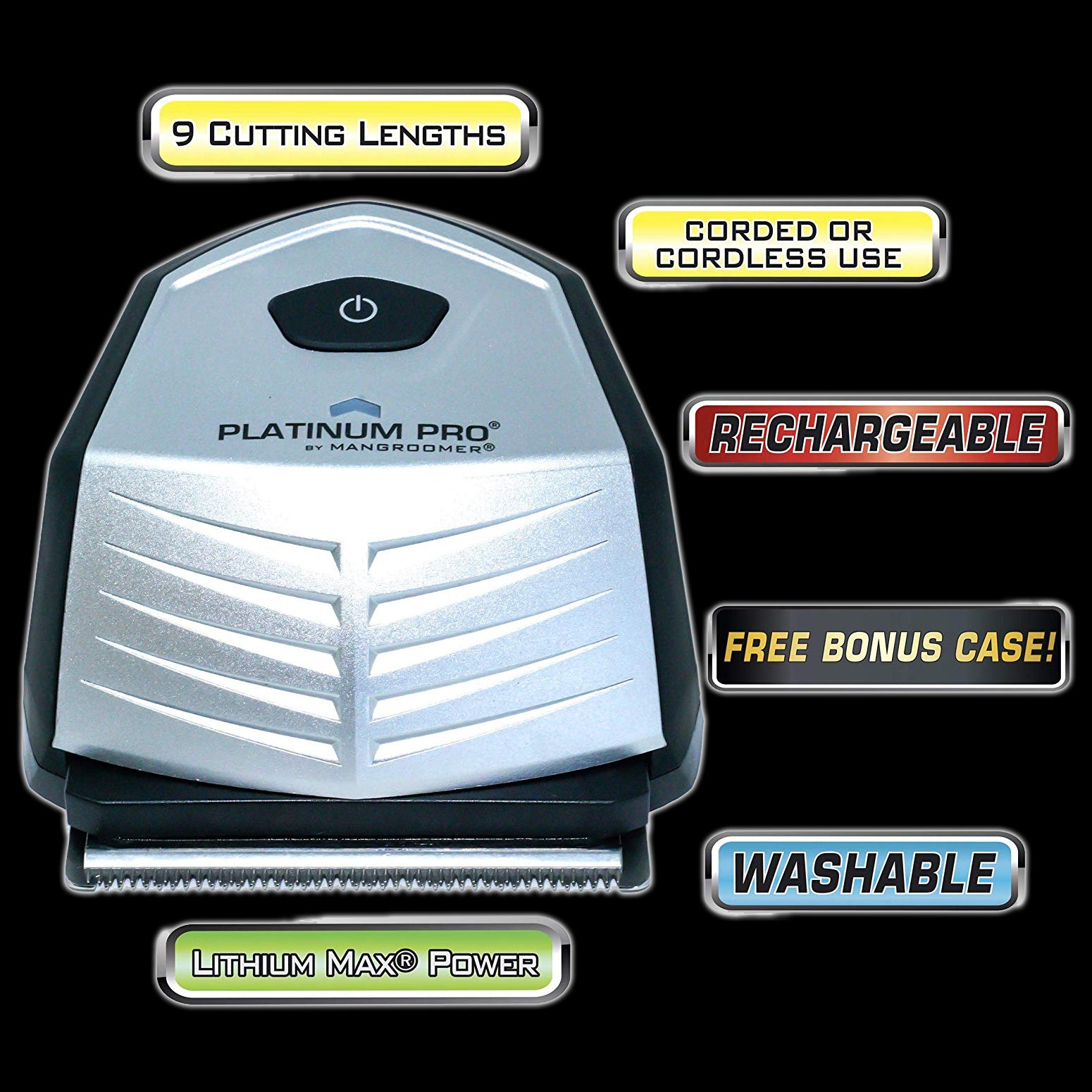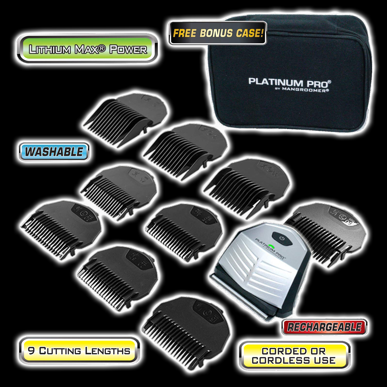Platinum Pro by MANGROOMER New Self-Haircut Kit and Advanced Hair Clippers with Lithium Max Battery, 9 Length Guards and Included Bonus Storage Case